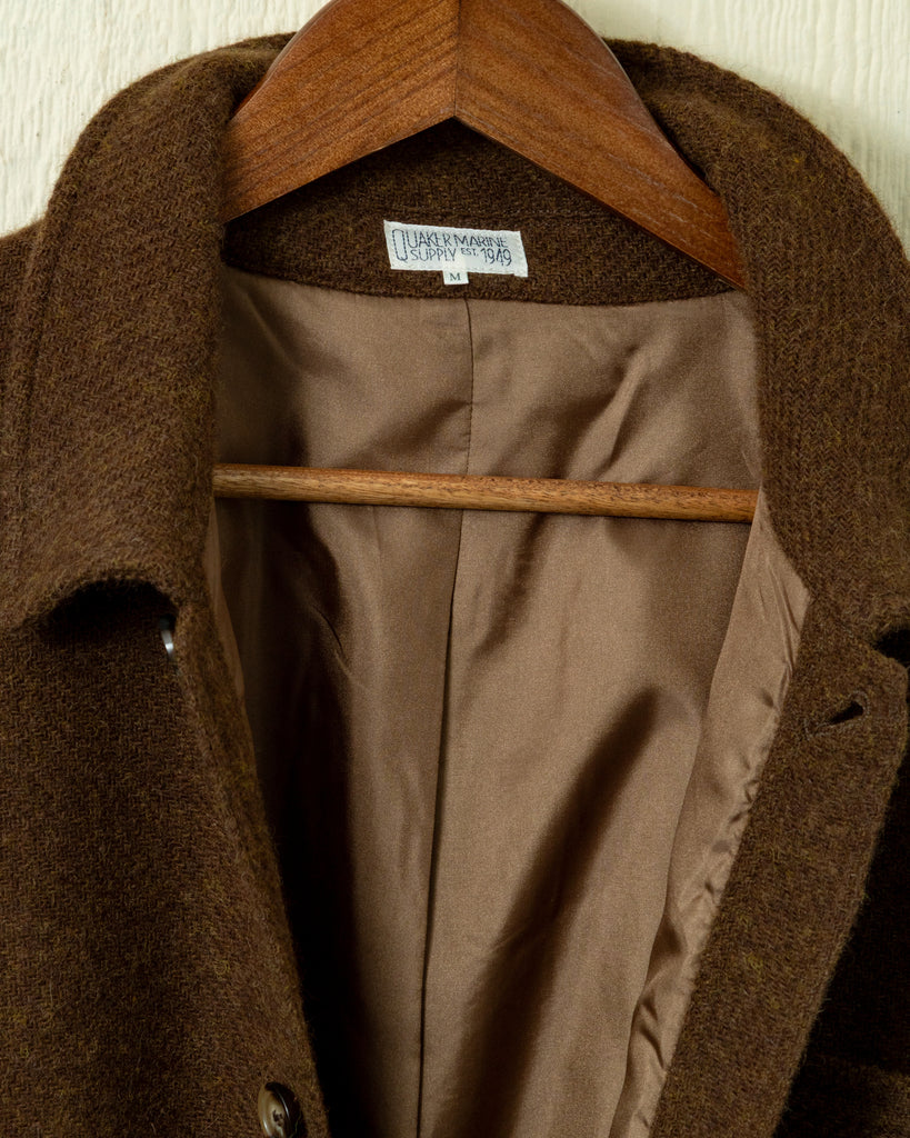 Quaker Marine Supply’s French Workman’s Jacket is fashioned from hearty wool fabric and fully lined for easy wear. The traditional workman’s jacket was designed in the late 1800s as a practical, protective layer for the French working class to wear over their clothes, complete with numerous patch pockets to hold tools and spare parts. We designed our workman’s jacket to serve as a piece of outerwear, as well as a stand-in for a sports-jacket in a pinch. This garment features three patch pockets and anchor-engraved buttons. The cuffs also have buttons so they can be rolled up.