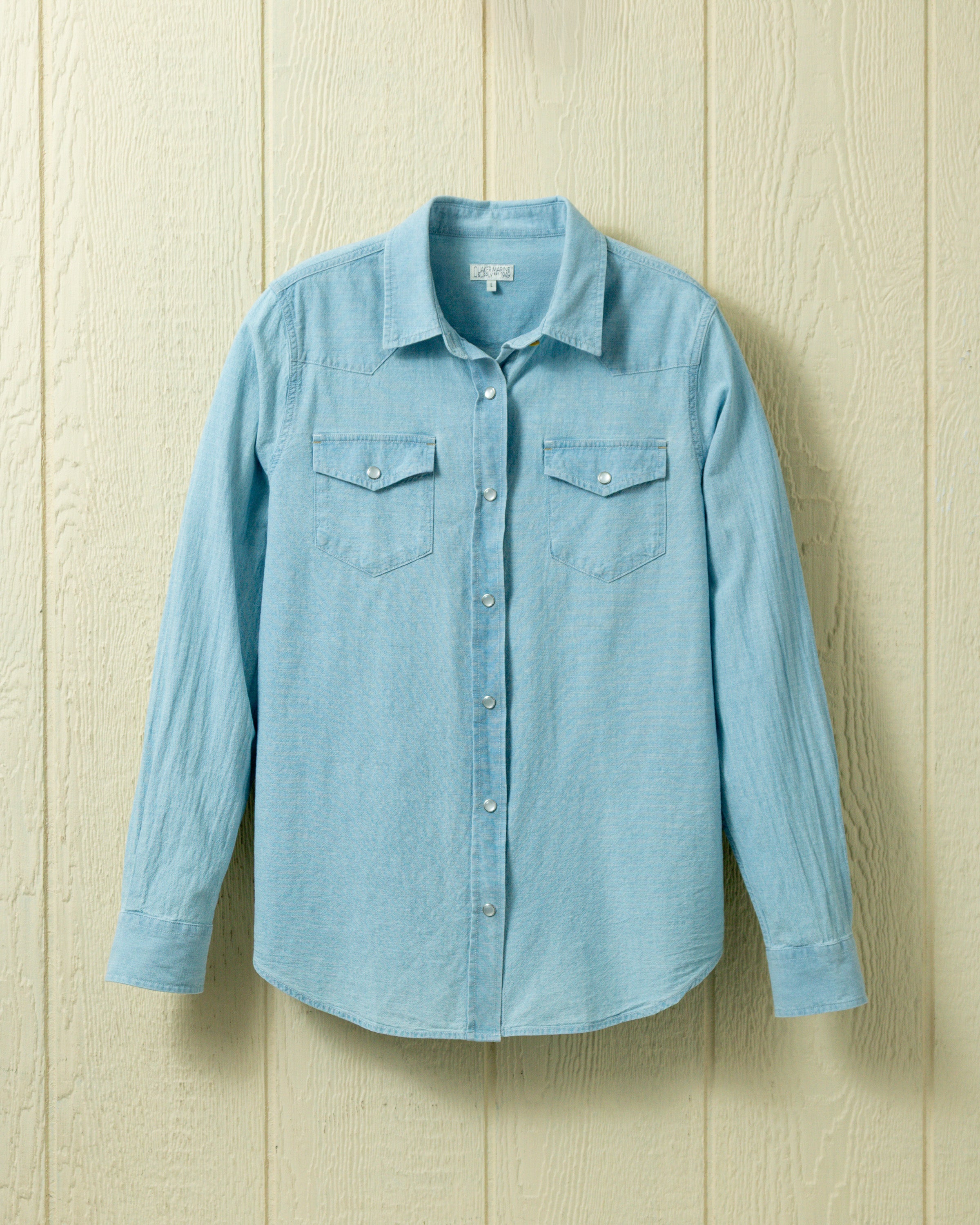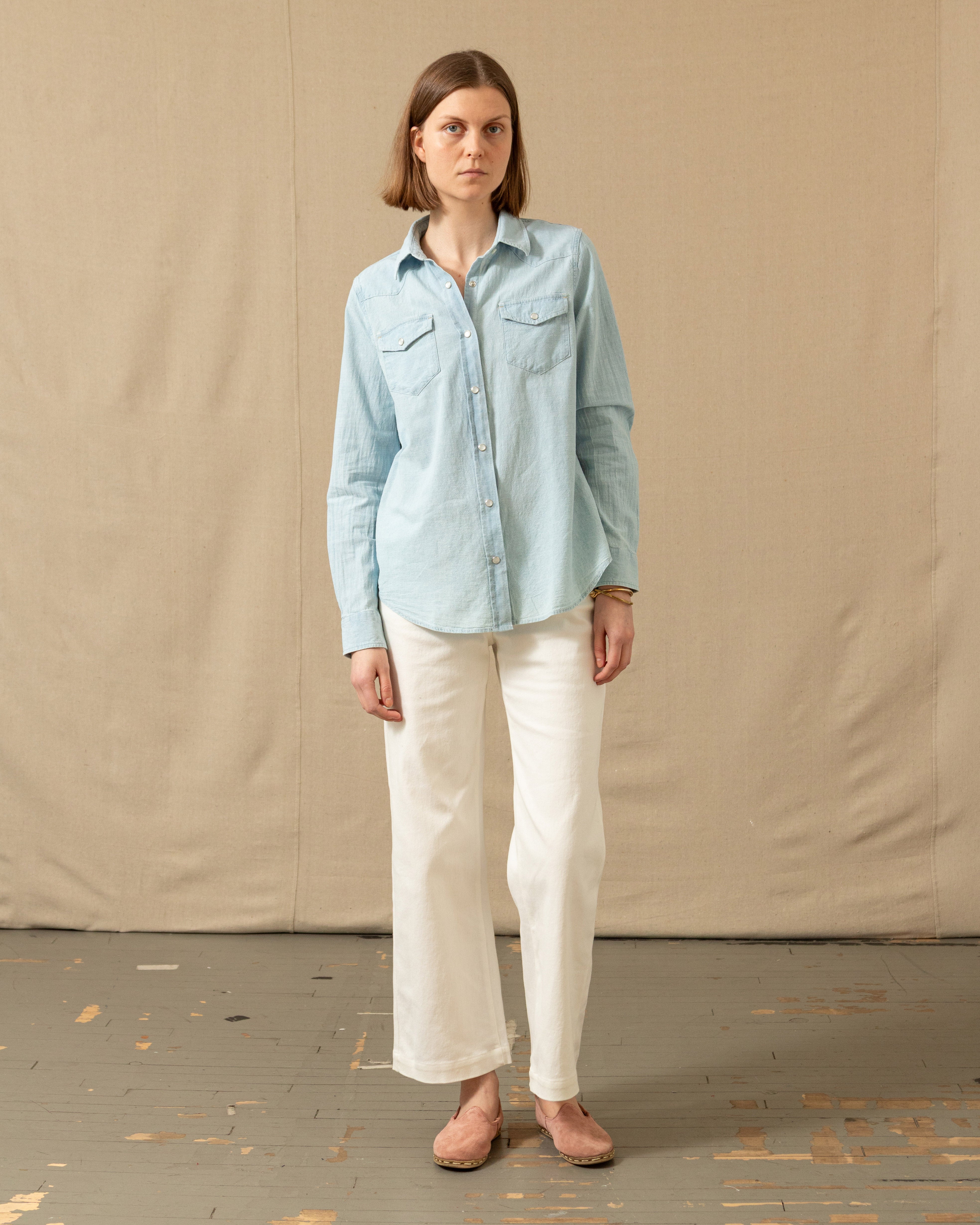 Our classic Western Shirt, now tailored with QMS woman in mind. No longer relegated to dude ranches, this shirt can add some refined flare under a blazer, but we think it looks best on its own with our wide leg 5 pocket corduroy pants or your favorite jeans (if you're brave enough for the Canadian tuxedo). We used mother of pearl snaps for a look that will never go out of style.