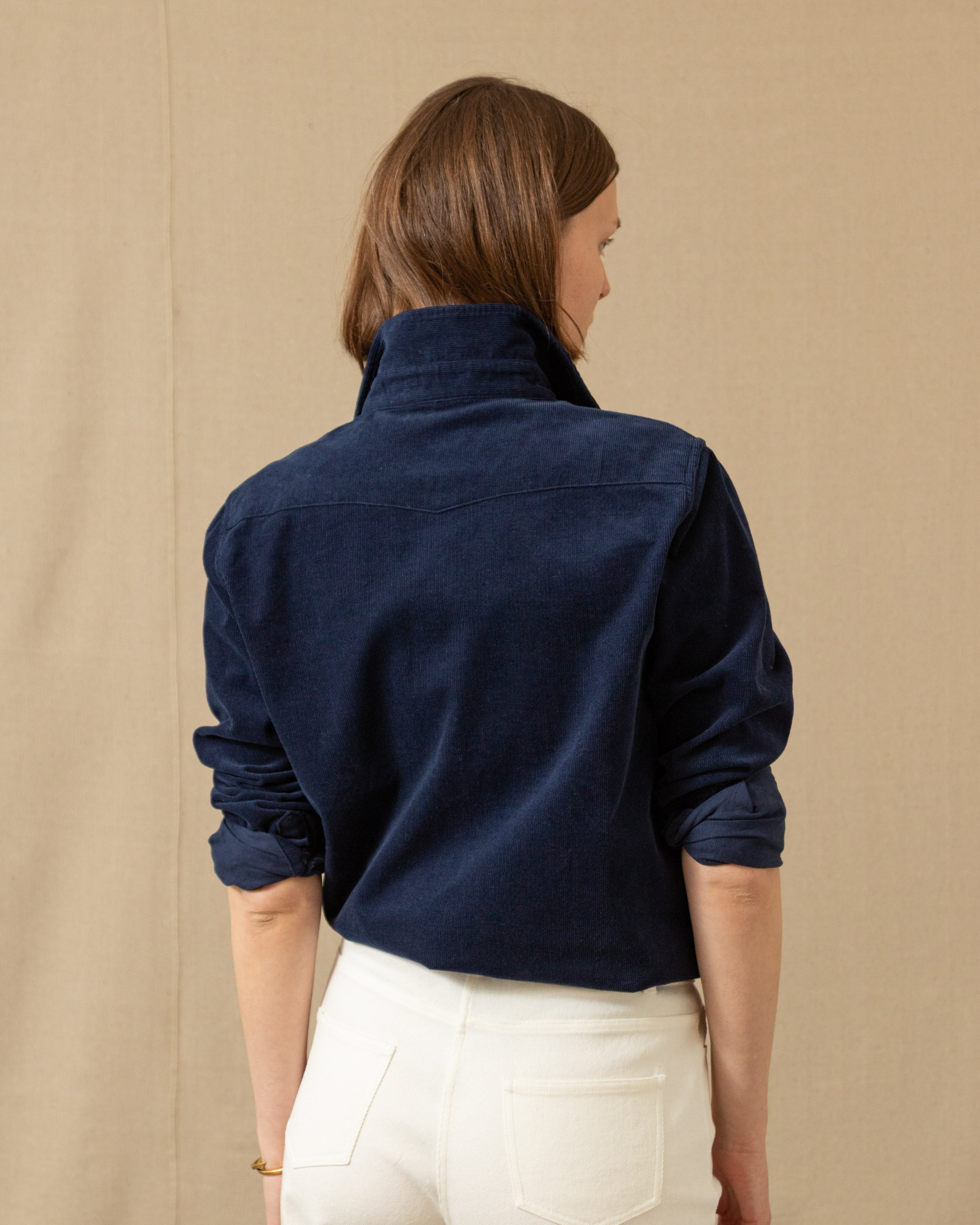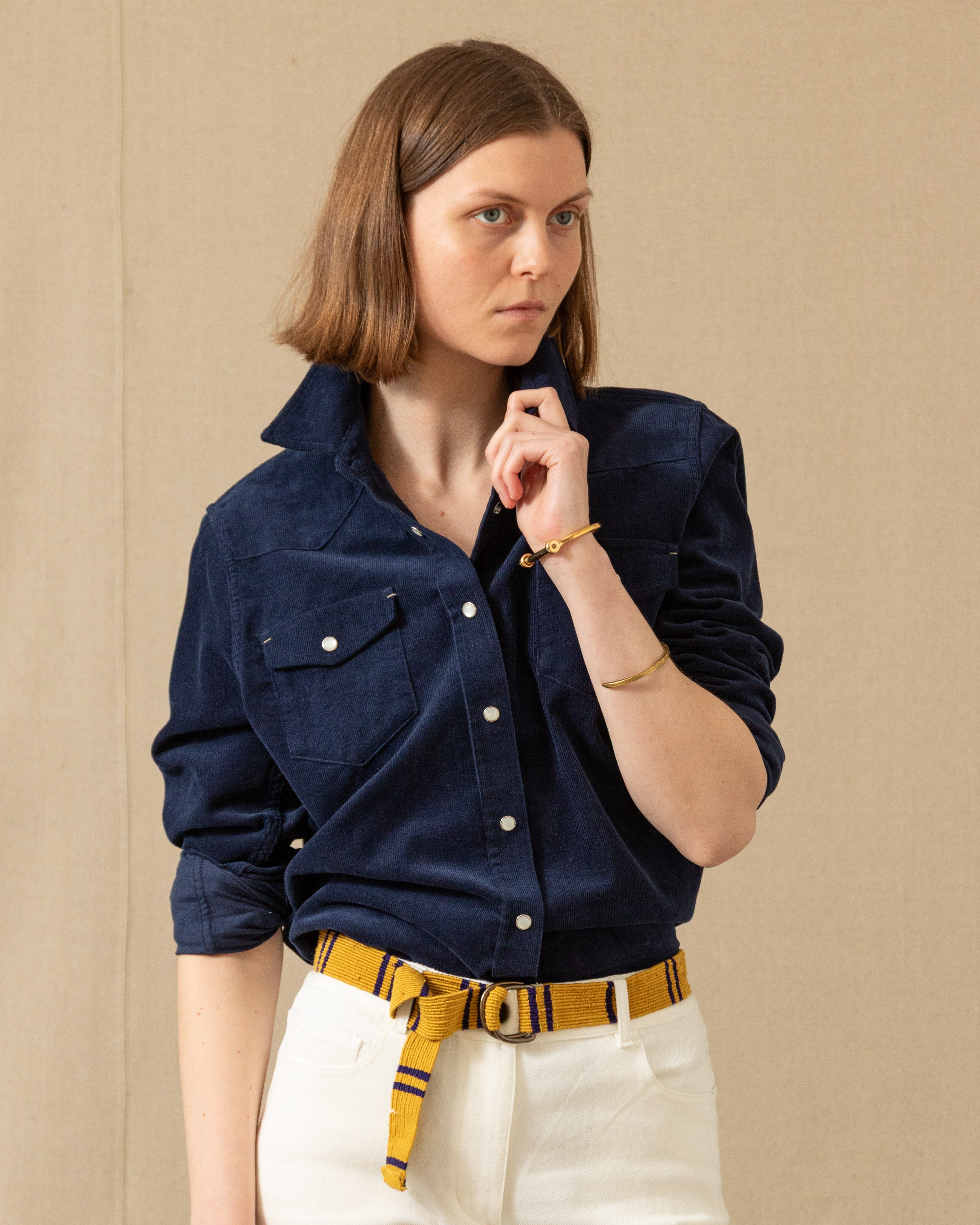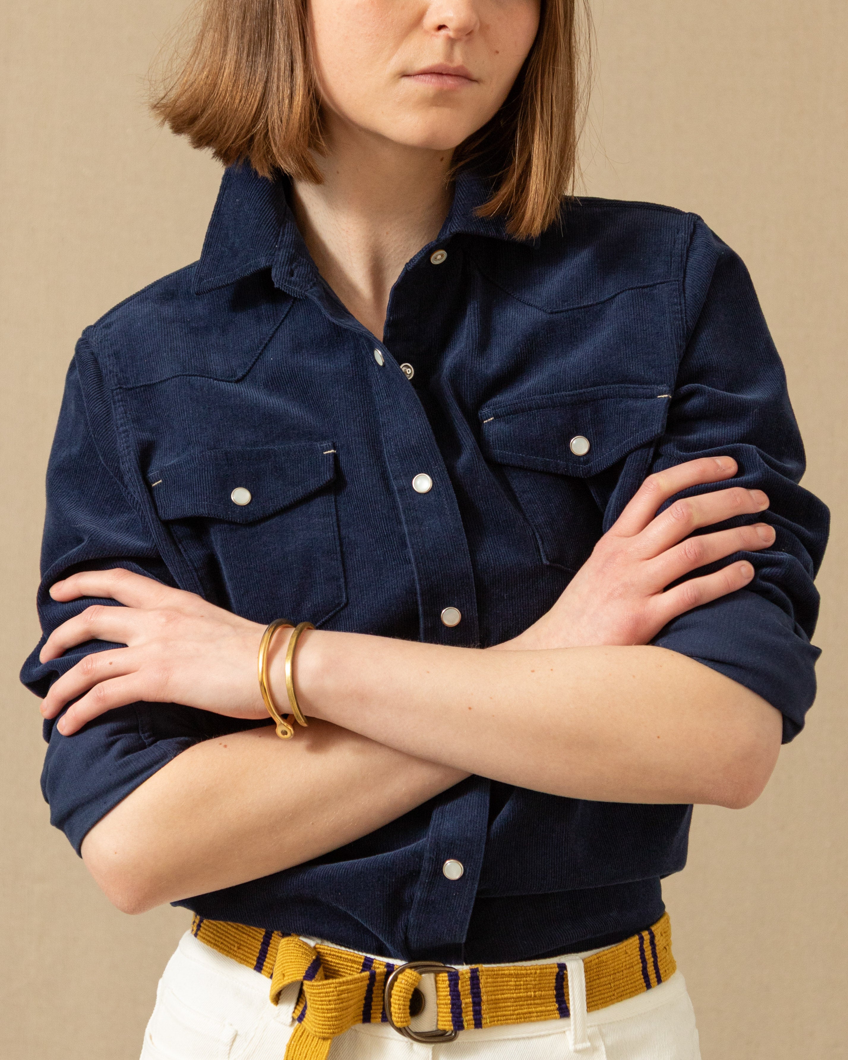 Our classic Western Shirt, now tailored with QMS woman in mind. No longer relegated to dude ranches, this shirt can add some refined flare under a blazer, but we think it looks best on its own with our wide leg 5 pocket corduroy pants or your favorite jeans (if you're brave enough for the Canadian tuxedo). We used mother of pearl snaps for a look that will never go out of style.