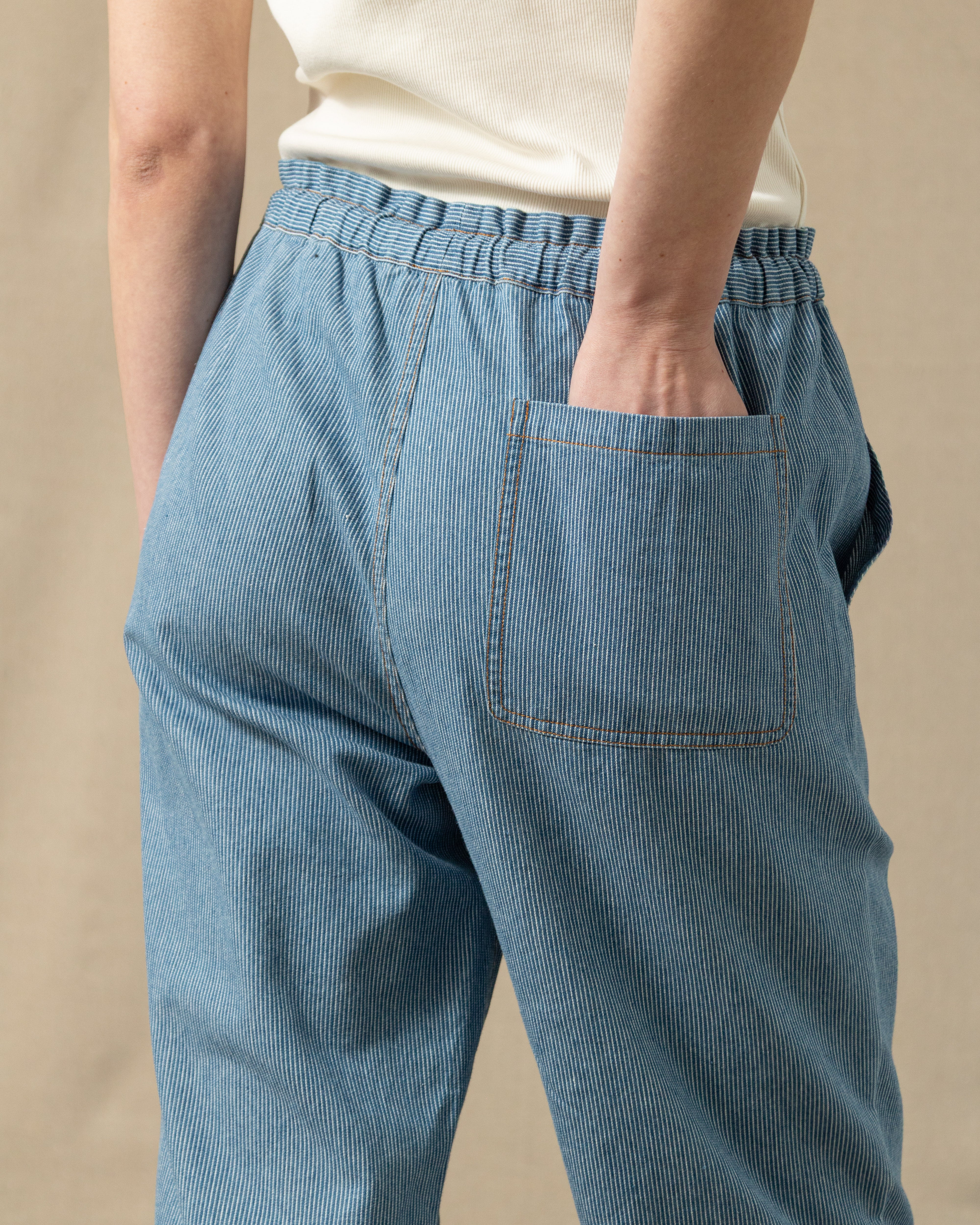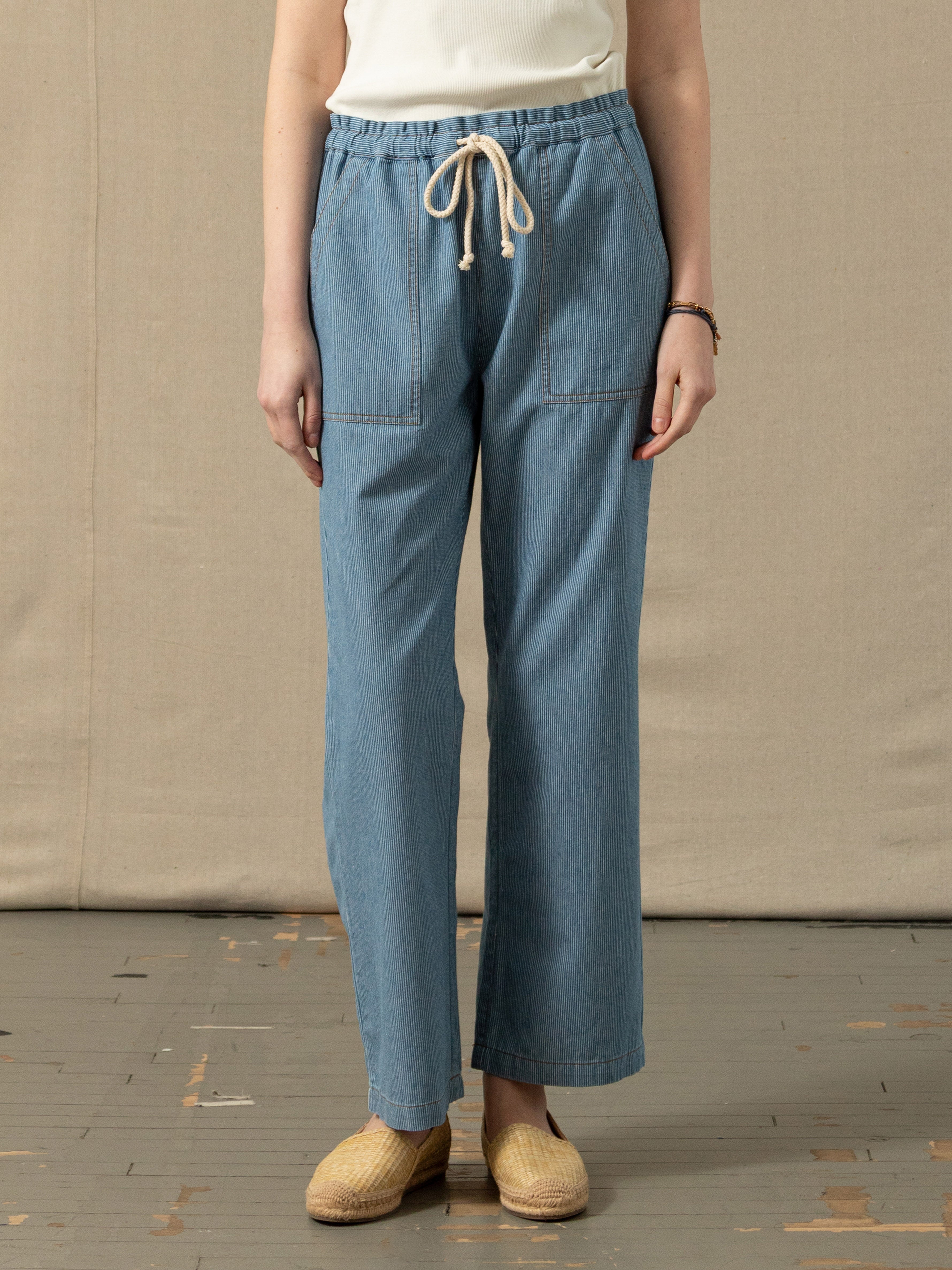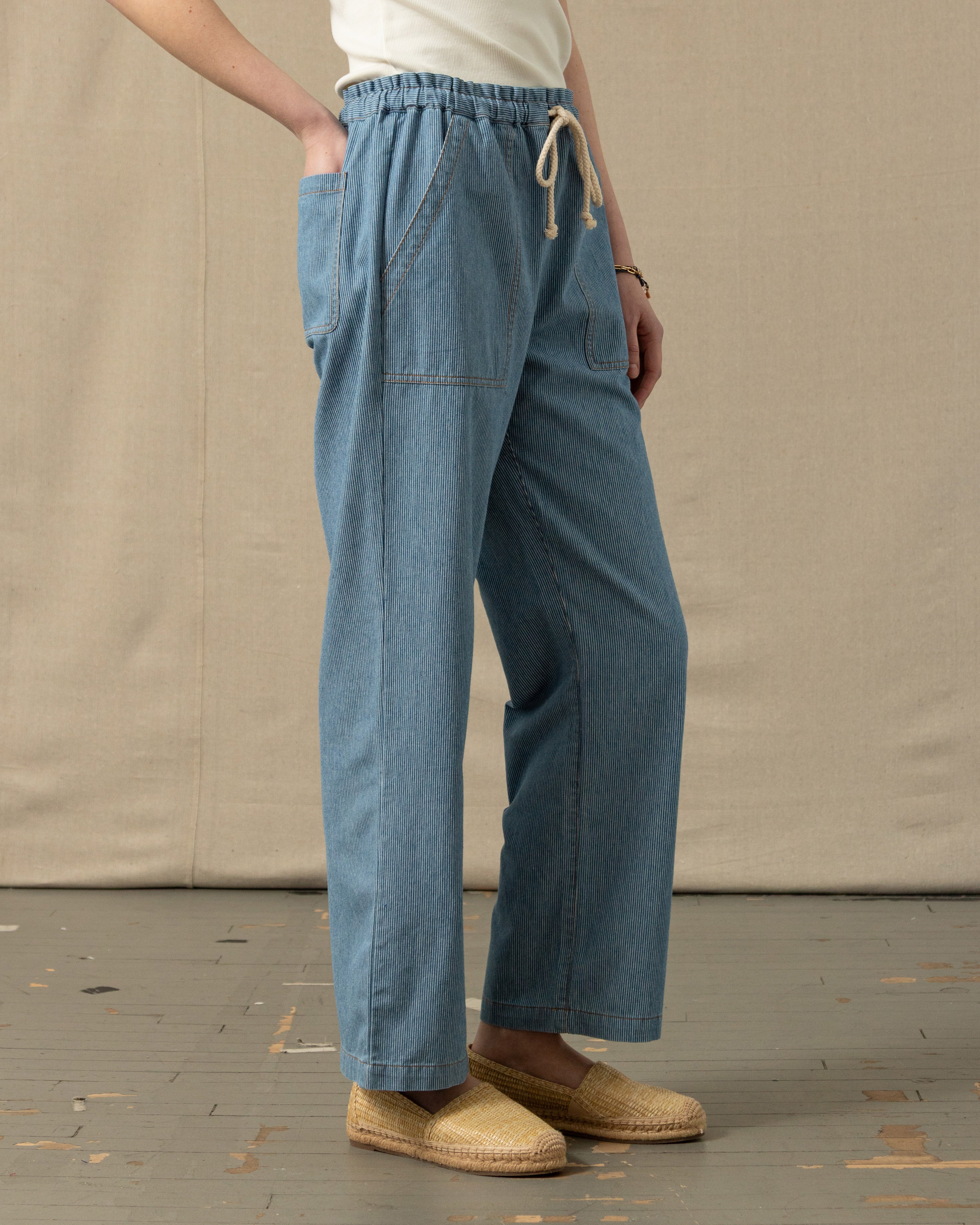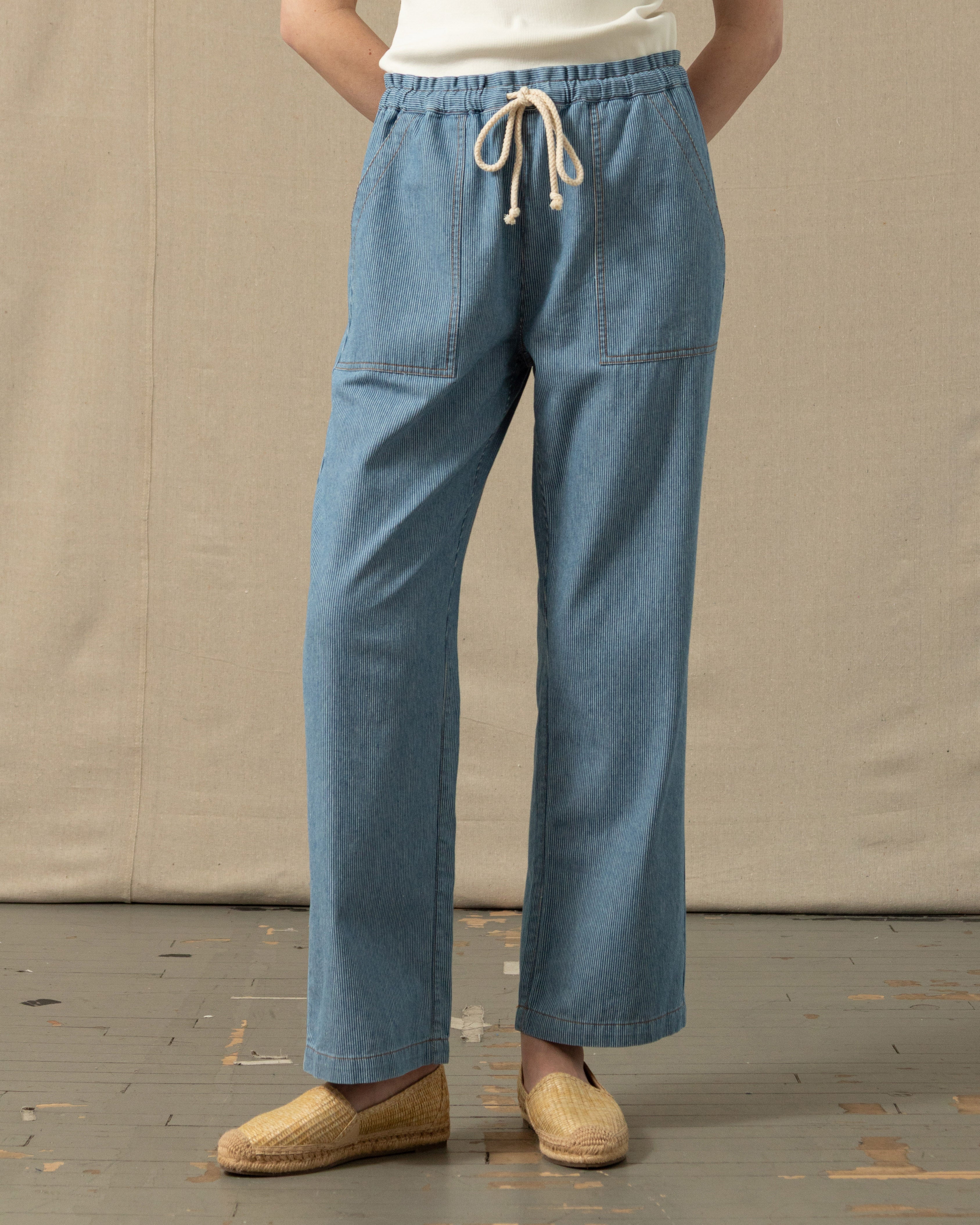 Step into effortless seaside style with our beach pants. They are cut from washed hickory stripe denim, and have a relaxed, easy fit. The adjustable drawstring waist keeps it casual. Pair it up with a linen shirt and your summer uniform is set.