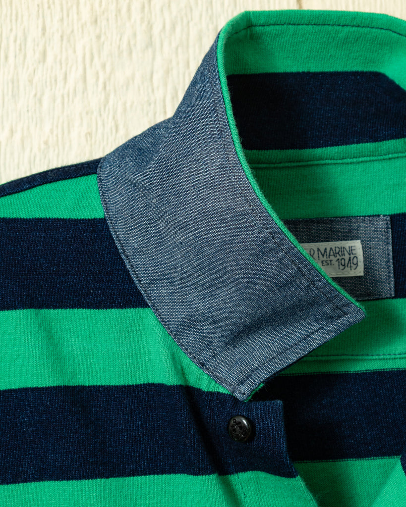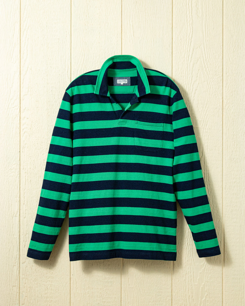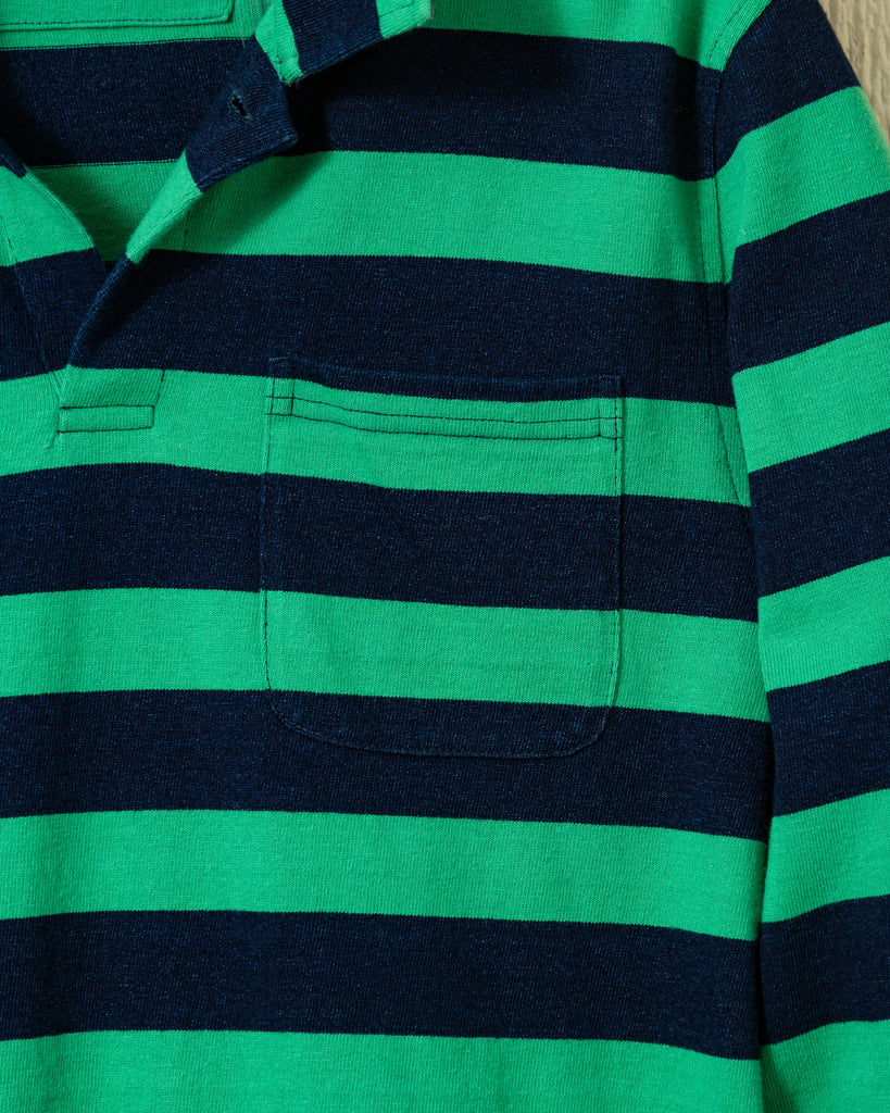 Long Sleeve Indigo Polo in Navy/Billiard Green Wide Stripe