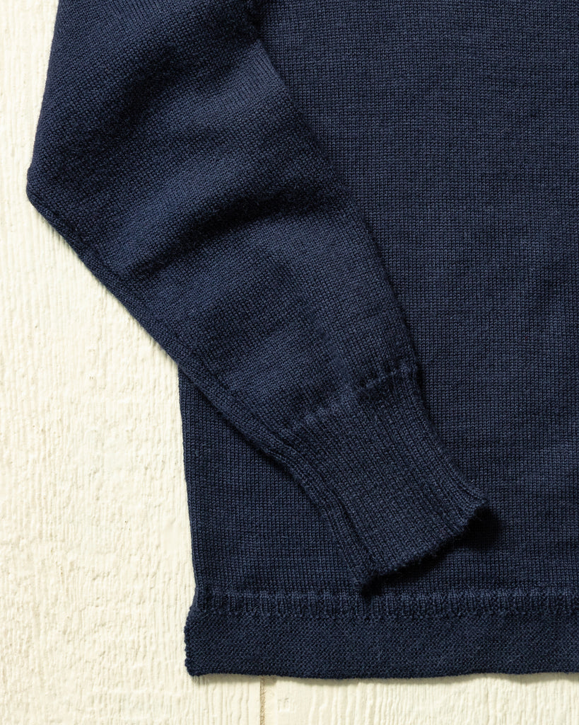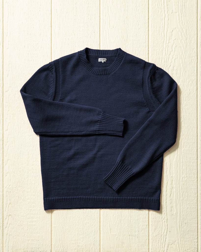 Next to the rollneck and turtleneck sweaters, the Guernsey is one of the most iconic pieces of maritime dressing ever. Named after the small island off the coast of Normandy from which it hails, the Guernsey sweater can be seen on fishermen and sailors of the channel island from 17th century all the way up to the present day. It's simple yet tough-as-nails construction has stood the test of time and our version honors that legacy. Made from merino wool and an updated, modern fit; it can handle whatever you can.